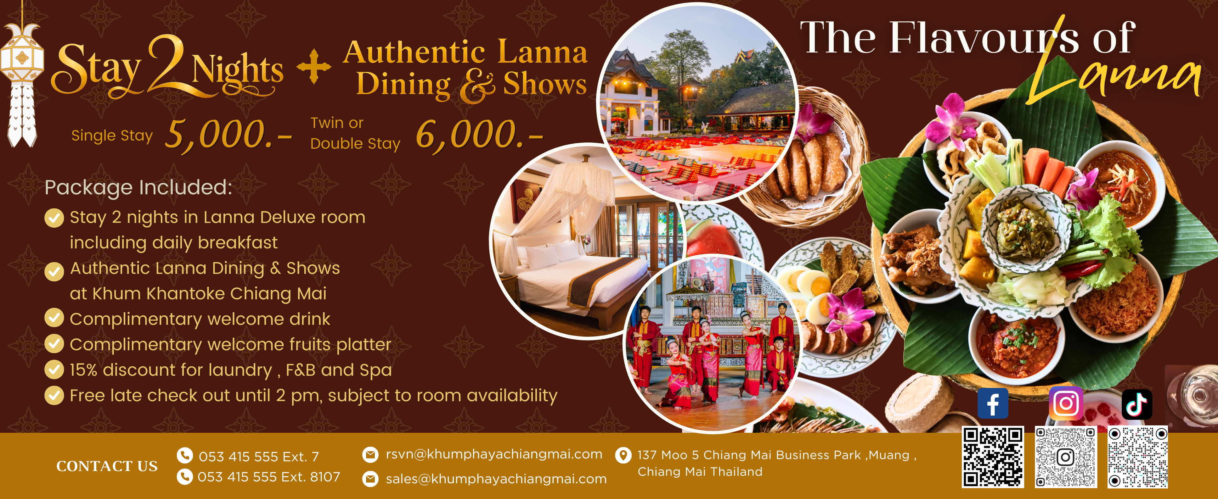 สัมผัสอรรถรสแห่งล้านนาแท้ กับแพ็กเกจ The Flavours of Lanna อิ่มเอมกับเสน่ห์เมืองเหนือ สัมผัสประสบการณ์พักผ่อนเหนือระดับ พร้อมดินเนอร์ขันโตกแบบล้านนาแท้ และตื่นตาตื่นใจไปกับการแสดงศิลปวัฒนธรรมล้านนา ณ "คุ้มขันโตก" เชียงใหม่